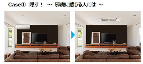 まずは「隠す」方法。壁面にアートやテレビなどお気に入りのものだけを配置する場合、エアコンで壁紙のカラーや色が分断されるのを避けるために天井カセット形にして隠すのだ。壁面の情報量が少なくなりスッキリしたデザインになる。
