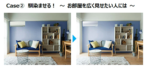 次が「なじませる」方法。壁面の色味に近いカラーのエアコンを選ぶのだ。ログハウスや和室など木目調の自然素材を多く使う部屋などは、アースカラーと相性のいいブラウン系やシャンパンゴールドなどのゴールド系も意外になじむという。