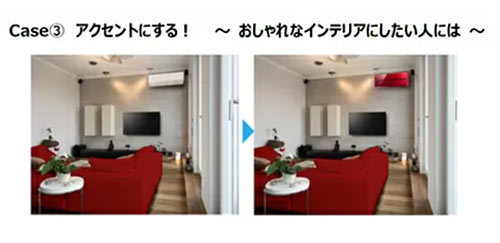 最後が「アクセント」として使う方法。デザイン性の高いエアコンを壁面のアイキャッチにすることで空間を格上げしてくれる。ここでのポイントは、セレクトしたエアコンの同系色のアイテムを少なくとも1点はインテリアに使うことだという。画像の例では、ソファとエアコンに赤色を使いテレビとAVボードを黒色にすることで、部屋全体をトータルでカラーコーディネートしている。