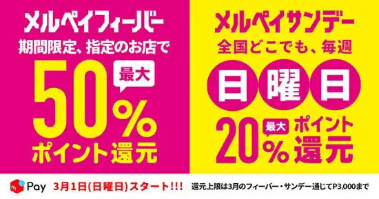 メルペイフィーバーは、対象店舗(コンビニエンスストア・ドラッグストア・飲食店・まちのお店)で、支払金額の最大50%相当分のポイントを翌日還元するキャンペーン。メルペイサンデーは、日曜日限定キャンペーンとなる。少し条件が複雑なところもあるが、開催期間が長いので3月中に還元上限を達成できるよう計画して利用するのもありだろう。