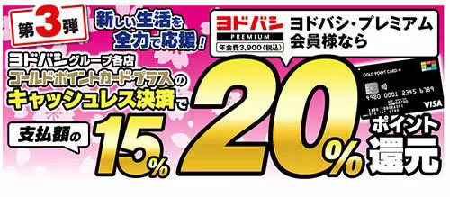 ヨドバシカメラの各店舗で会員カード「ゴールドポイントカード・プラス」のクレジットカード決済で買い物をすると、現金購入の場合と同率の通常ポイント(商品により10%)に、5%(クレジット決済ポイント1%+キャンペーンポイント4%)が加わって最大15%のポイント還元。ヨドバシ・プレミアム会員なら、通常ポイント(商品により10%)に、10%(クレジット決済ポイント1%+キャンペーンポイント9%)が加わって最大20%ポイント還元となる。