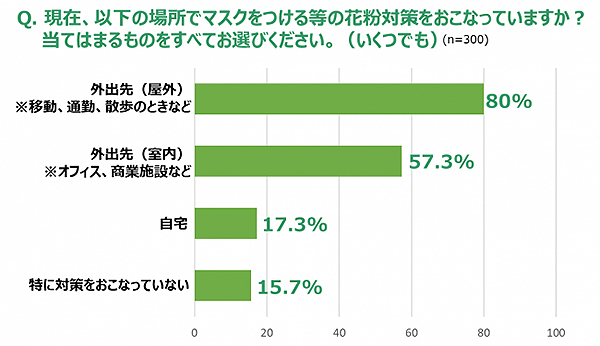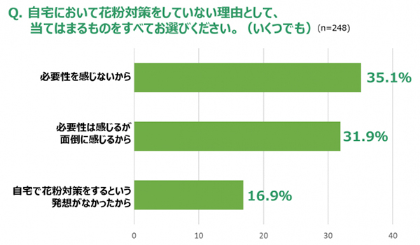 外出先や自宅などで花粉対策をしているかどうか聞いたところ、外出先で8割の人が花粉対策を行っているのに対し、自宅では約2割にとどまる結果となった。その理由として、「必要性を感じないから」「(必要性は感じるが)面倒に感じるから」といった回答が多く集まった。