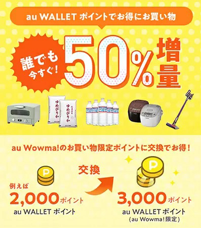 スマホ決済サービス「au PAY」の「誰でも!毎週10億円!もらえるキャンペーン」におけるステージ1(2月10日~3月1日)の還元が3月10日ごろに付与された。付与された「au WALLET」ポイントをそのままau WALLET残高にチャージして使ってもお得だが、もっとお得になる可能性がある。今なら、ECサイト「au Wowma!」限定のau WALLETポイントに交換すると、50%増量するからだ。