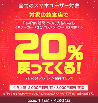 対象となる店舗で、PayPay残高で支払うと20%のPayPayボーナスがポイントとして還元される。Yahoo!プレミアム会員は25%の還元だ。付与上限は2000円相当/回、3000円相当/期間となる。2月のときの付与上限は500円相当/回、1500円相当/期間で、それよりも付与上限が増えている。