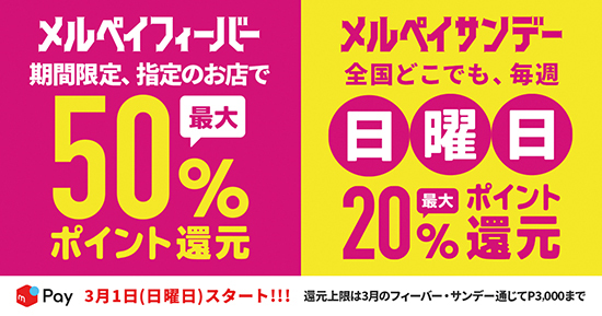 メルペイフィーバーは、対象店舗で最大50%相当分のポイントを翌日還元する。コンビニのみ最大20%還元となる。メルペイサンデーは全加盟店が対象。日曜日限定のキャンペーンで、最大20%相当分のポイントを翌日還元する。どちらのキャンペーンも還元率は「メルペイの本人確認を完了しているか」「年齢が18歳以上か」で変動する。