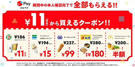 メルペイでは、特定店舗で11円から買えるお得なクーポンも配布している。受け取る条件は期間中に初めてメルペイの本人確認をすること。すでに完了しているユーザーは対象外だ。先述したメルペイフィーバーやメルペイサンデーと併用可能。期間は4月30日まで。