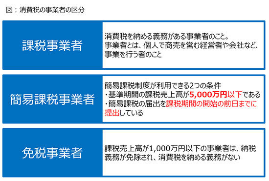 ここで、消費税について少し触れよう。消費税には図のように三つの事業者区分がある。特に注意していただきたいのが、「簡易課税事業者」。業種によって税率が決められていて計算が簡単な上、課税事業者の計算よりも納税額が多少でも少なくなる可能性もある。そのため、「自分の場合はどちらにすればいいのか」を考えて選択することが大切だ。