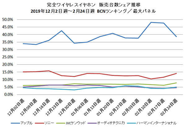 週次の販売台数シェア推移ではアップルが一時50%目前まで上昇。2番手のソニーは、差は大きいものの10%以上をキープしている。