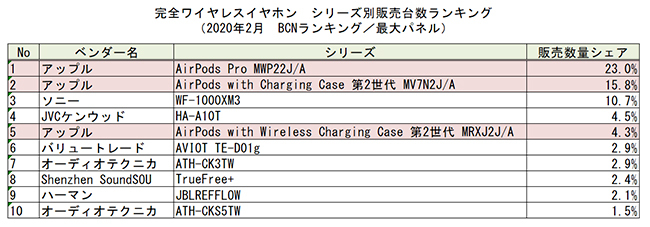 シリーズ別の販売台数ランキングでは上位モデルの「AirPods Pro」が「AirPods with Charging Case 第2世代」を逆転。23.0%の高シェアでトップに立った。AirPods3モデルの合計シェアは43.1%で、前月より6.4ポイントも上昇している。(BCN・大蔵 大輔)