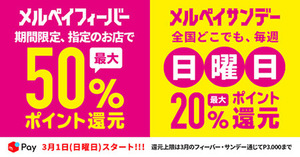 メルペイは「メルペイフィーバー」と「メルペイサンデー」の二つのキャンペーンを3月31日まで展開中。上限金額は両キャンペーン合わせて、3000ポイント/期間、500ポイント/回、コンビニのみ300ポイント/回。「メルペイフィーバー」は対象店舗で最大50%相当分のポイントを翌日還元する。コンビニのみ最大20%還元となる。「メルペイサンデー」は全加盟店が対象。日曜日限定のキャンペーンで、最大20%相当分のポイントを翌日還元する。業態によって開始日・終了日が異なり、ドラッグストアでお得になるのは21日まで。飲食店は28日、コンビニとまちのお店は31日までとなっている。これまでまちのお店の詳細は明かされていなかったが、現在はアプリから確認することができ、大手家電量販店やTSUTAYA、BOOK OFF、トイザらスなどが名を連ねている。