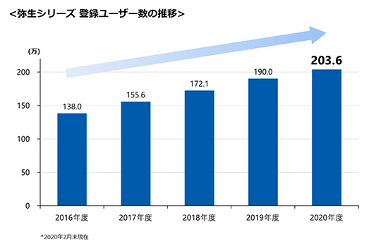 弥生シリーズは、中小企業、個人事業主、起業家などスモールビジネス事業者のバックオフィス業務(会計、給与計算、販売管理、顧客管理)を支えるソフトウェア。「かんたん、あんしん、たよれる。」をコンセプトに、クラウドアプリケーションとデスクトップアプリケーションを提供している。両アプリケーションを利用する顧客が着実に増加し、登録ユーザー数が2月末時点で200万を突破した。