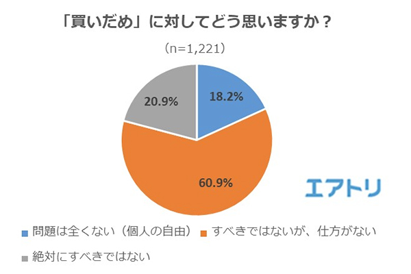エアトリが2020年3月22~24日に20代以上の男女1221人に実施した「買いだめ」に関するネット調査によると、「買いだめ」についてどう思うかという質問に、18.2%が「問題は全くない(個人の自由)」、60.9%が「すべきではないが、仕方がない」と回答し、「絶対にすべきではない」と答えたのは20.9%だった。