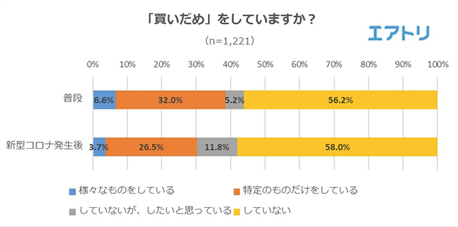 普段と新型コロナ発生後を比較して「買いだめをしていますか」という質問では、「様々なものをしている」「特定のものだけをしている」の割合が、普段は38.6%だったの対し新型コロナ発生後は30.2%となり、8.4ポイント減少した。エアトリでは「買いだめを問題視する報道を多く目にするが、実際は一部の人たちによって引き起こされている」と分析する。