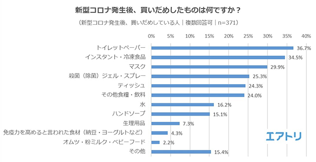 それでも実際に「買いだめした」と回答した30.3%の人(371人)は、どういう行動をとったのだろうか。複数回答で聞いた購入した商品では「トイレットペーパー」(36.7%)、「インスタント・冷凍食品」(34.5%)、「マスク」(29.9%)、「殺菌(除菌)ジェル・スプレー」(25.3%)などとなった。エアトリでは、本当にほしいのはマスクだが、店頭から消えた不安からトイレットペーパーなど、そのほかの商品の買いだめ行動をしたのではないかと推察する。