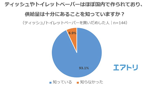 さらに、トイレットペーパーを買いだめした11.7%の人(144人)に、「ティッシュやトイレットペーパーが国内で作られていて供給量が十分にあることを知っているか」と聞いたところ、93.1%が「知っている」と回答した。