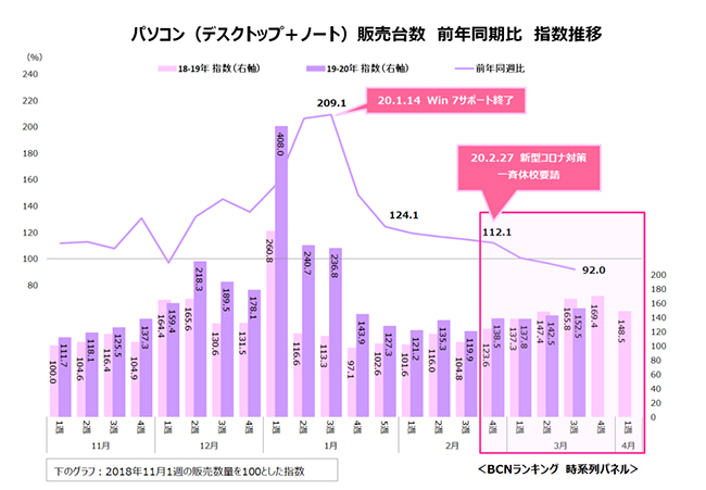 【BCN速報値】 全国の主要家電量販店・ネットショップのPOSデータを集計した「BCNランキング」によると、3月第3週(3月16~22日)のPC販売台数は前年比92.0%となり、前週の96.7%から一段と悪化した。新型コロナウイルスの対策で3月25日に東京都の小池百合子知事が外出自粛要請を出し、周辺の神奈川県や埼玉県、千葉県、栃木県の知事も連携する形で、週末の土、日の外出自粛要請を発表した。東京の人の流入を抑制する動きが強まったことで、3月第4週(3月23~29日)のさらなる悪化は確実だ。