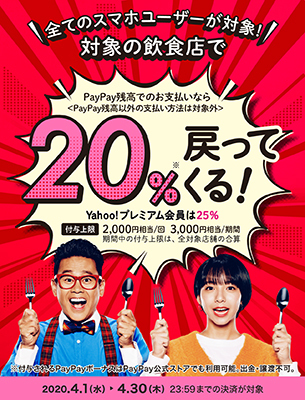 4月に絶対押さえておきたいスマホ決済のキャンペーンは、PayPayの「全国の有名飲食チェーンが対象!春のグルメまつりキャンペーン」。対象の飲食店でPayPay残高で決済すると、20%のPayPayボーナス(Yahoo!プレミアム会員は25%)を還元する。付与上限は2000円相当/回、3000円相当/期間。