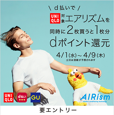 d払いは4月1日にユニクロとGUでキャンペーンを開始。ユニクロでは対象のエアリズムインナー、GUでは対象のTシャツを2点同時にd払いで購入すると1点分のdポイントを還元する。
