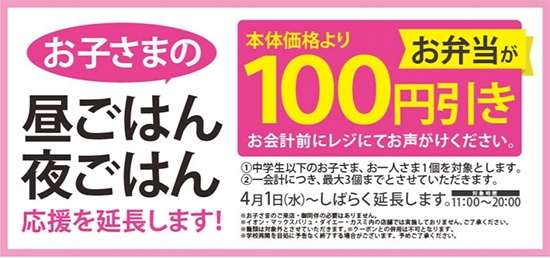 休校で自宅待機になっている子どもの昼食や夕食の負担軽減に貢献している対象店舗もある。オリジン弁当は3月13日から中学生以下の子どもを対象に弁当の100円引きを開始。3月31日までの予定だったが、期間を延長して4月も実施している。