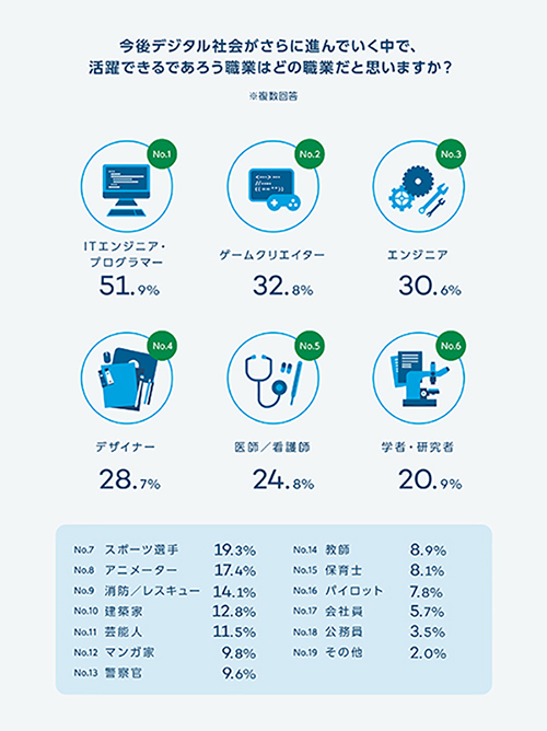 今後のデジタル社会で活躍できる職業のトップ3は、人気の高い職業の「医師/看護師(24.8%)」「スポーツ選手(19.3%)」「公務員(3.5%)」などを抑える結果となった。