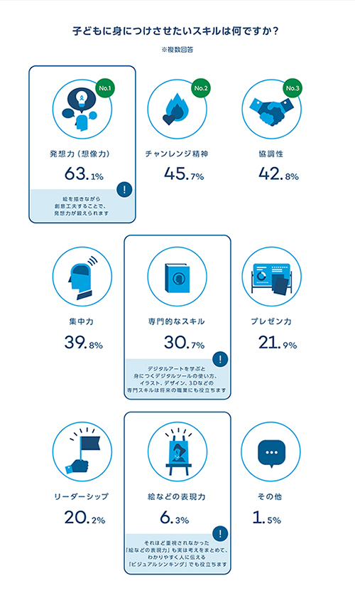 また、親が子供に身につけさせたいと思うスキルは「発想力(想像力)(63.1%)」「チャレンジ精神(45.7%)」「協調性(42.8%)」という結果になった。デジタル社会でクリエイティビティを発揮するため重要な要素の一つとされる発想力がトップだった。