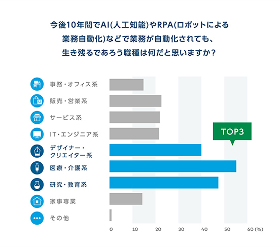 今後10年間でAI(人工知能)やRPA(ロボットによる業務自動化)が普及しても生き残る職種について聞いた質問では、「医療・介護系」「研究・教育系」に次いで「デザイナー・クリエイター系」がトップ3に入った。
