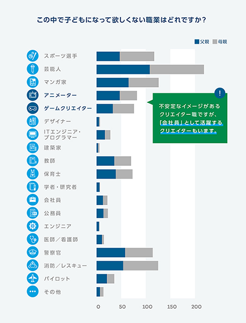 デジタル社会で活躍する職業や子供にはチャレンジ精神を求めるのとは裏腹に、実際に就いてほしい職業は高収入や安定性を求める保守的な親の姿が浮かび上がる。「デザイナー(8.0%)」「ゲームクリエイター(3.9%)」などクリエイティブ系の職業は下位だった。
