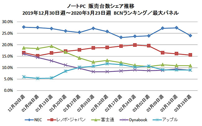 販売台数シェアを週次推移でみると、1月20日週にレノボが富士通を上回り、それ以降は15~20%でNECに次ぐ2位につけている。アップルはWindows 7サポート終了直後からシェアが回復。3月末には「MacBook Air(2020)」を発売し、今後の上昇が予測される。