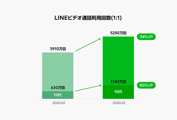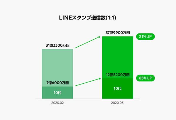 LINEが4月7日に発表した利用動向に関するレポートによると、3月から全国一斉休校や外出自粛、リモートワークなどの影響を受けて、LINEを使ったユーザーのコミュニケーションが大きく変わった。グループトークやビデオ通話などの利用が急増。中でも10代のスタンプ送信数は前月比65%増、ビデオ通話は同80%増となった。