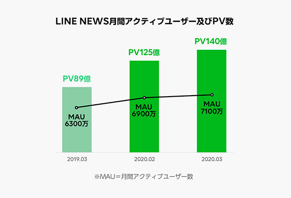 19年3月に6300万だったLINE NEWSの月間アクティブユーザー数(MAU)は、20年3月に過去最高の7100万を記録した。3月の月間PVも過去最高の140億PVだった。新型コロナウイルスに関する最新状況をLINE NEWSでチェックして、トークでシェアする動きが全世代で増加。休校要請の発表があった2月27日は前日比1.5倍のシェアがあったという。