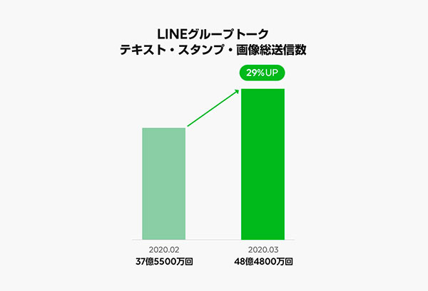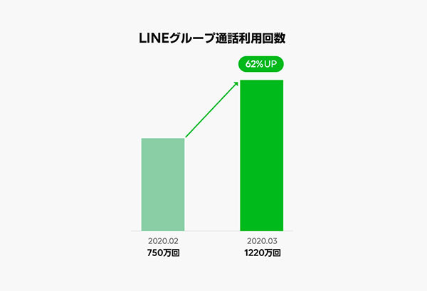 新型コロナの危機意識の高まりとともに、3月のLINEグループトーク(テキスト・スタンプ・画像総送信数)は前月比で29%増加した。グループ通話の利用回数も全世代で利用が増加した結果、前月比で62%増加した。