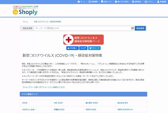 マスクの在庫や価格情報を一覧できるショップリーの「新型コロナウイルス・感染症対策特集ページ」