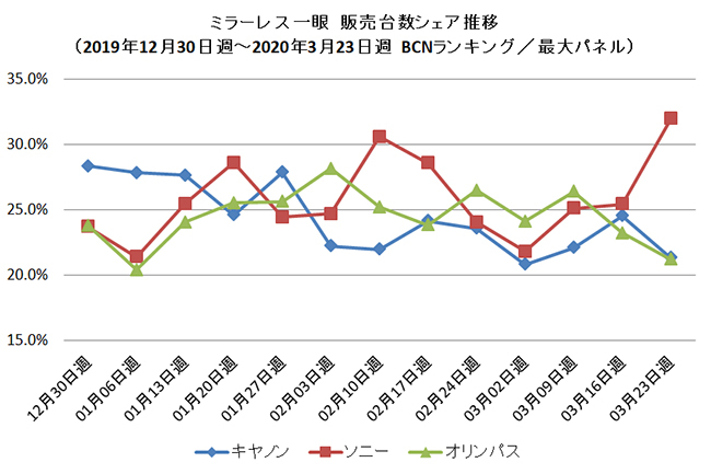 メーカー別の販売台数前年比も市場全体と連動して低迷。ソニーが44.5%、オリンパスが54.9%、キヤノンに至っては32.3%まで数字を落とした。ただ、シェアとしては4番手ながら富士フイルムのみ115.6%と伸長。販売台数シェアでは年明けから上位3社による混戦が続いていたが、3月中旬以降はソニーが突き抜け、30%超を記録している。