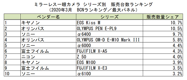 全国の家電量販店やECショップでPOSデータを集計する「BCNランキング」によると、3月のミラーレス一眼デジタルカメラの販売台数は前年比49.5%。1月が90.1%、2月が76.5%と年明け以降は前年割れが続いていたが、新型コロナウイルス感染拡大の影響で状況はさらに悪化した。
