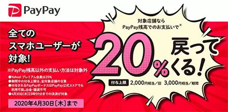 PayPayは4月1日から対象の飲食店でPayPay残高で決済すると、20%のPayPayボーナス(Yahoo!プレミアム会員は25%)を還元する「全国の有名飲食チェーンが対象!春のグルメまつりキャンペーン」を開催中。付与上限は2000円相当/回、3000円相当/期間。