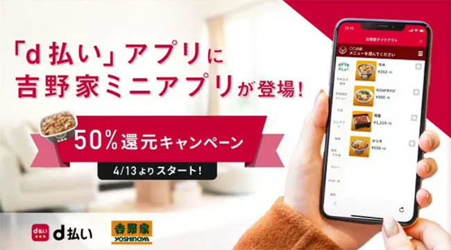 d払いは4月6日にd払いアプリ内にオンラインから注文・決済ができる「吉野家ミニアプリ」を追加。それを記念して13日から「吉野家 d払いミニアプリ限定! 50%dポイント還元キャンペーン」を開始する。