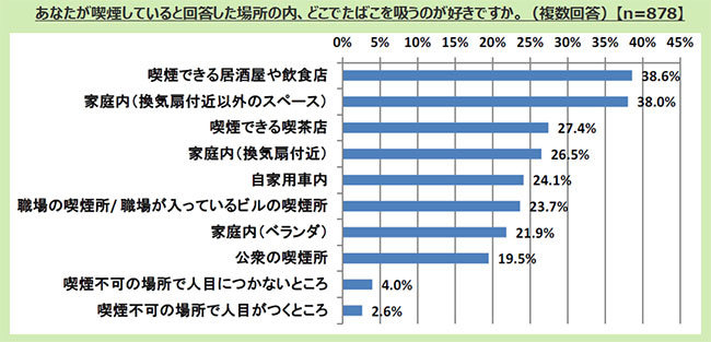 実は、最後の逃げ場として利用傾向が高まっているのが「家の中」だ。調査会社のネオマーケティングが喫煙者878人に「どこで喫煙するのが好きか」と質問したところ、トップは「喫煙できる居酒屋や飲食店(38.6%)」。そして、2位に「家庭内(換気扇付近以外のスペース)(38.0%)」がランクインしている。