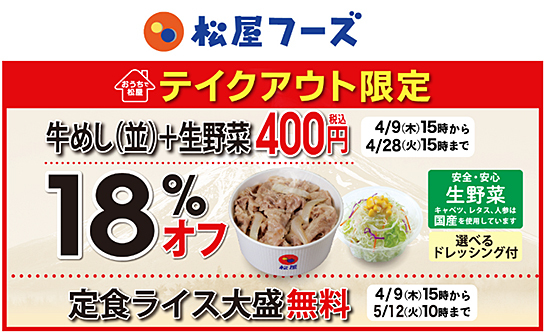 松屋では、肉だけでなく野菜とセットにすることで、バランスのいい食事を家庭に提供するという。テイクアウト限定の牛めし(並)と生野菜のセットが、通常の税込み価格490円が400円の18%割引になる。生野菜とセットの牛めしは、並以外の大きさでも90円引きになる。