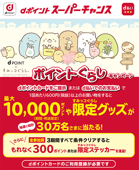 期間ごとにキャンペーンサイトで、応募コース(dポイントコース/すみっコぐらしグッズコース)を選んでエントリーの上、対象店舗でdポイントカードの提示またはスマートフォン決済サービス「d払い」で、1回当たり税別600円以上買い物をすると、抽選で毎月10万人にdポイント最大1万ポイント(期間・用途限定)や、毎月変わる、すみっコぐらし限定グッズが当たる。