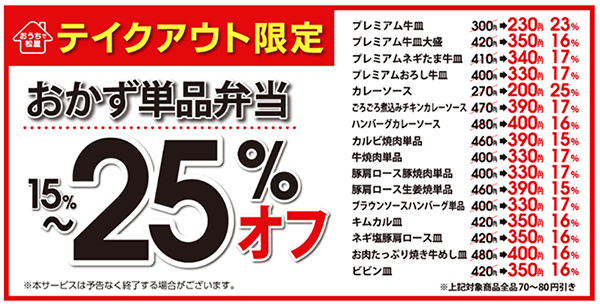 家にご飯があれば、松屋のおかず単品をテイクアウトするとお得になる。例えば、通常税込み300円のプレミアム牛皿が23%オフの230円で、通常270円のカレーソースが25%オフの200円で購入できる。松屋では“ご飯があれば松屋のおかず”のキャッチフレーズで訴求する。