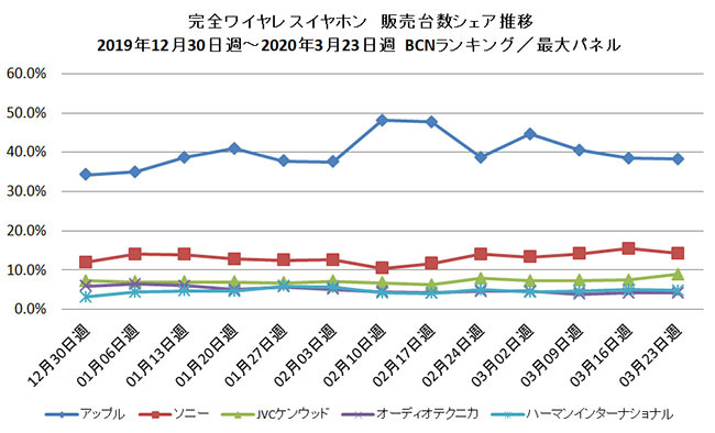 週次の販売台数シェア推移ではアップルの優位は変わらないが、2月は50%手前で推移していたが、3月は40%手前まで後退している。2位のソニー以外で躍進が目立つのがJVCケンウッド。昨年はラインアップが少なかったこともあるが、前年比では599.4%を記録し、3番手につけている。