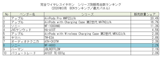 シリーズ別の販売台数ランキングでは「AirPods Pro」が20.4%でトップ。2位は「AirPods with Charging Case 第2世代」、3位はソニーの「WF-1000XM3」がランクインした。注目は2月29日に発売したソニーの「WF-H800」。WF-1000XM3のコスパ機ともいえる同モデルがAirPodsの対抗馬となれば、シェア争いはより白熱したものになってくるだろう。(BCN・大蔵 大輔)