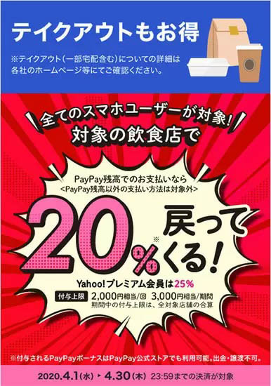 新型コロナウイルスの感染拡大による外出自粛などによって、飲食店では営業時間の短縮やテイクアウトの対応が広がっている。PayPayが4月30日まで実施中の20%のPayPayボーナスが還元される「全国の有名飲食チェーンが対象!春のグルメまつりキャンペーン」でも、テイクアウトや宅配対応の飲食店が増えている。