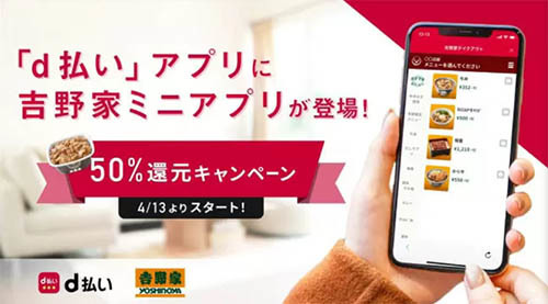 d払いは、d払いアプリ内にオンラインから注文・決済ができる「吉野家ミニアプリ」を追加。4月13日から「吉野家 d払いミニアプリ限定! 50%dポイント還元キャンペーン」を実施している。対象は、ミニアプリ利用者。還元上限は、1アカウントにつき500ポイント。エントリー必須で、支払方法は残高払いもしくはdカードが対象になる(dカード以外のクレジットカードは対象外)。期間は5月10日まで。