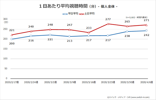 平日の平均視聴時間も3月30日の週から伸び、緊急事態宣言が発令された4月6日の週に242分となっている。