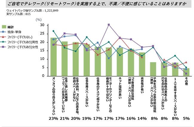 同社が2019年11月に実施した調査によれば、自宅のテレワークで不満/不便に感じていることとして、「オンオフの切り替えがしづらい」「仕事に適した共用部(ワークスペース)が充実していない」が上位となった。