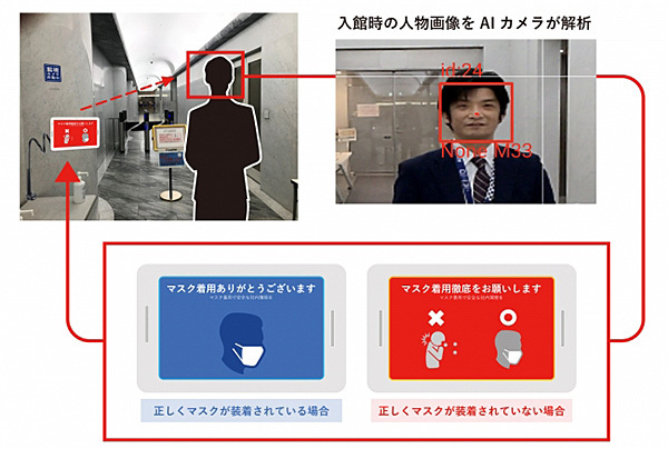 実証実験の第1弾として、オフィス入館時のマスク装着/未装着を自動で判定し、未装着の場合、受け付けにアラートを表示する「マスク装着検出・アラート表示」の実証を実施する。これによって、入館時のマスク装着徹底を効率的に行うことが可能になり、従業員や関係者の安全安心な環境整備を目指す。