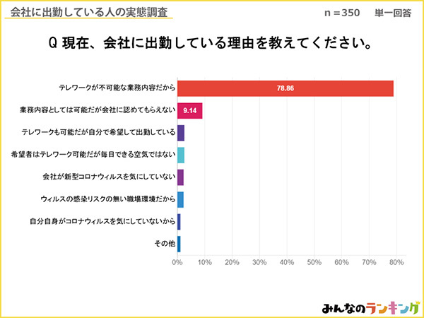 出勤している理由は、「テレワークが不可能な業務内容だから」が78.86%と大多数を占めている。なかでも、美容室をはじめとする「サービス業」や「製造業」、スーパーマーケットやコンビニエンスストア、ドラッグストアを含む「商社・卸売・小売業」などが多かった。