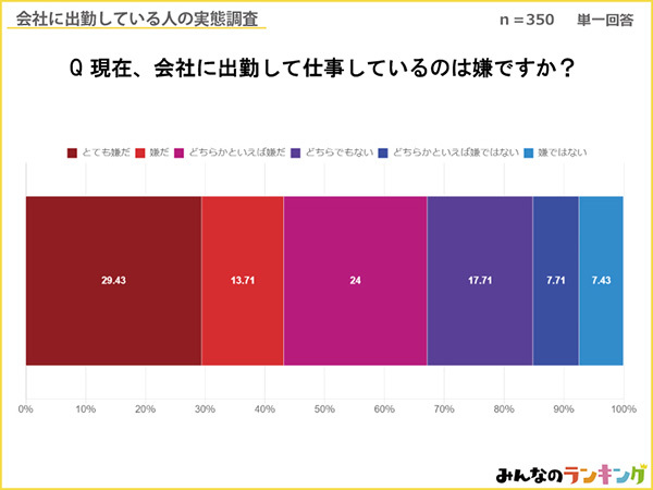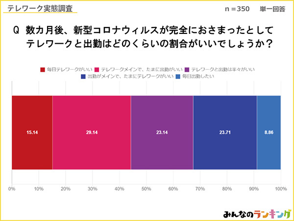 出勤していると回答した人のなかで、「出勤して仕事するのは嫌ですか?」という質問に対して「とても嫌だ」と回答したのは29.43%。次いで、「嫌だ」(13.71%)、「どちらかといえば嫌だ」(24.00%)という結果になっている。新型コロナウイルスの終息後については、「テレワークメインで、たまに出勤がいい」(29.14%)が最多。次いで「出勤がメインで、たまにテレワークがいい」(23.71%)、「テレワークと出勤は半々がいい」(23.14%)となった。「毎日テレワークがいい」は15.14%、「毎日出勤したい」は8.86%だった。