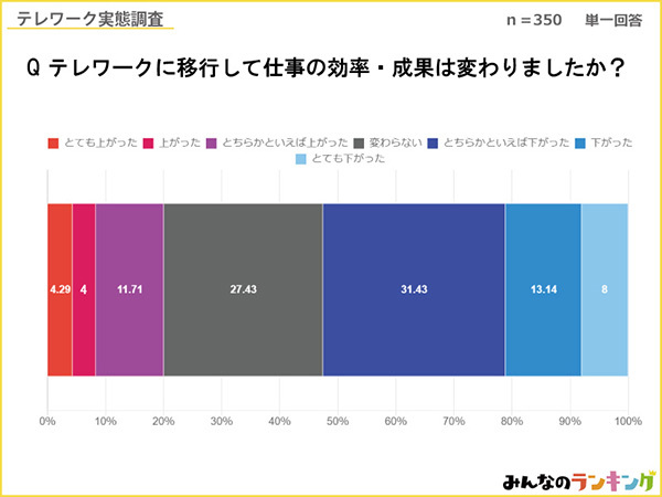 テレワークに移行してからの仕事の効率については、「どちらかといえば下がった」(31.43%)が最多。子どもがいる家庭などでは、自宅での仕事は難しいのが現状だ。次いで「変わらない」との回答が27.43%だった。これら以外では「下がった」(13.14%)、「とちらかといえば上がった」(11.71%)、「とても下がった」(8.00%)と続き、テレワークでは仕事の効率が多少落ちる傾向があると言える。